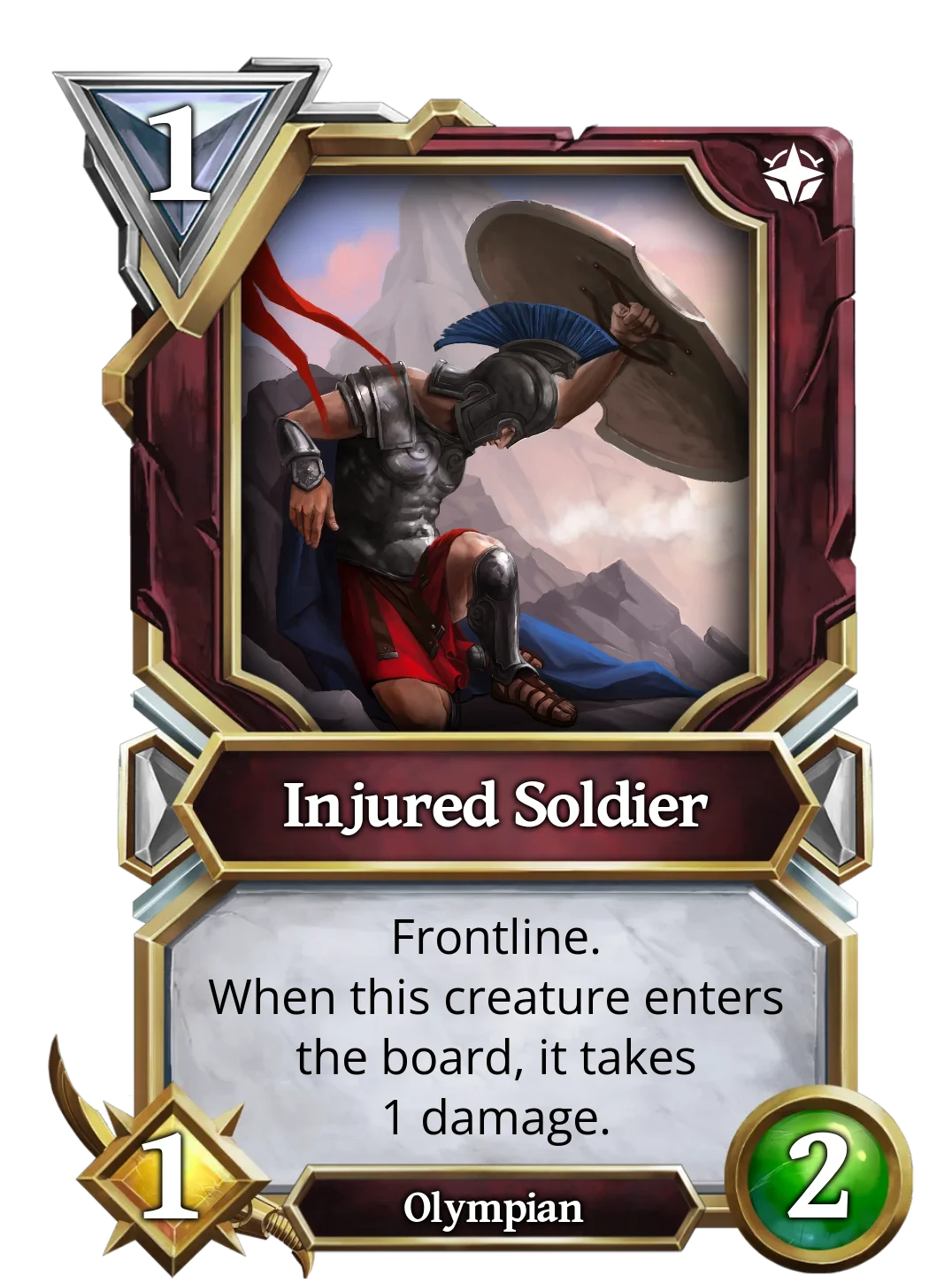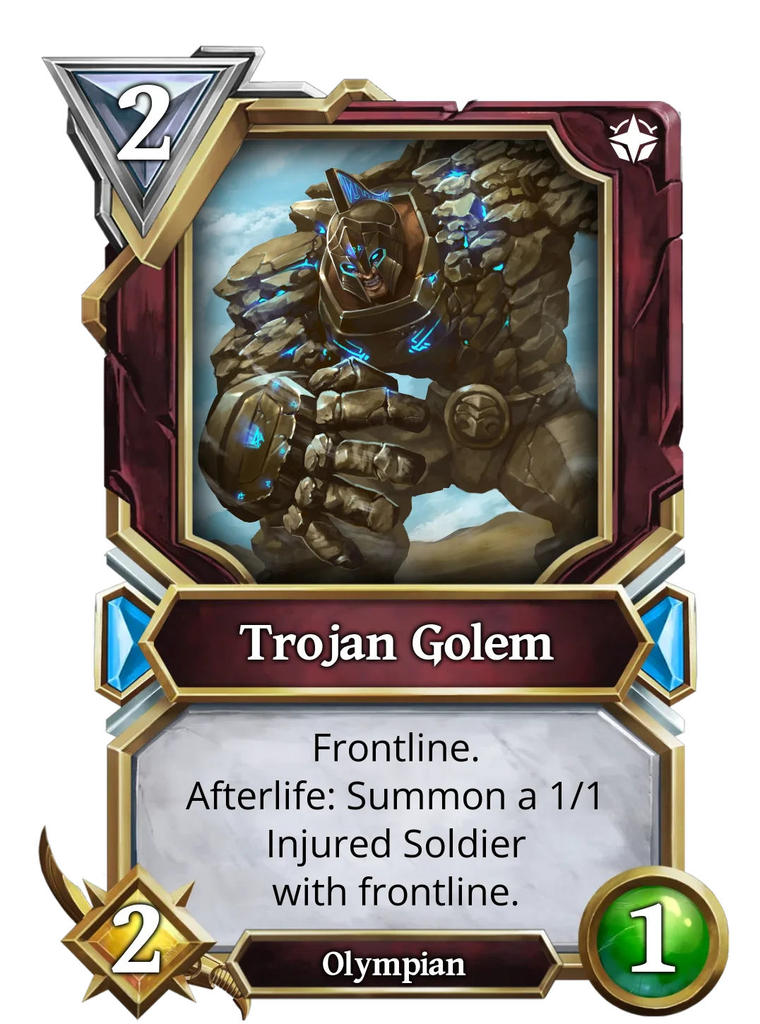 Trojan Golem may only have 2/1 stats, but when destroyed, it summons a Injured Soldier, who takes 1 damage when it enters the board, but will at least be a creature of 1/1 with frontline.