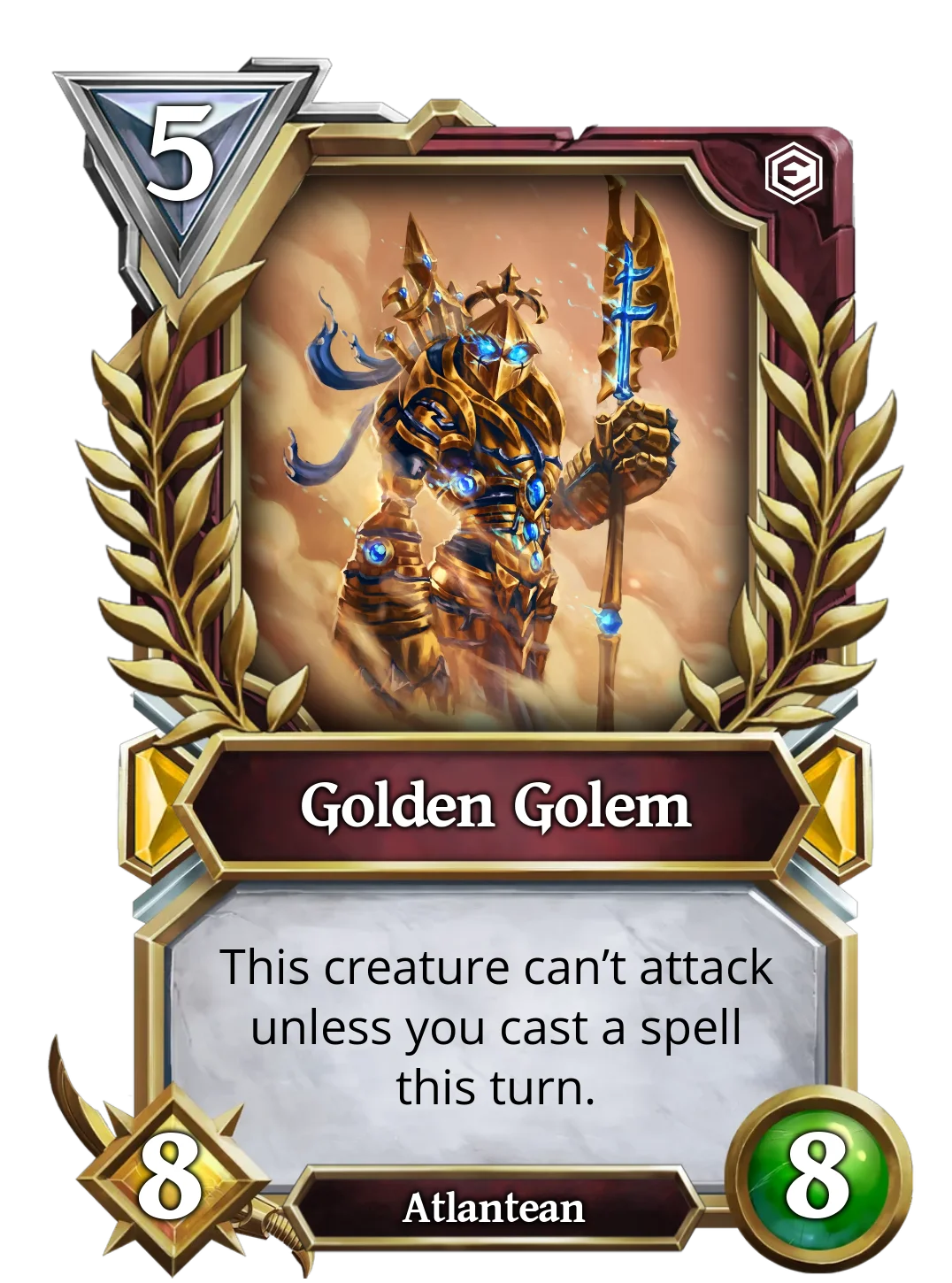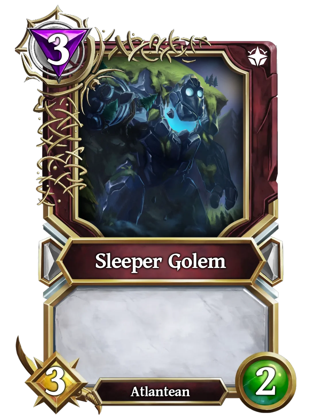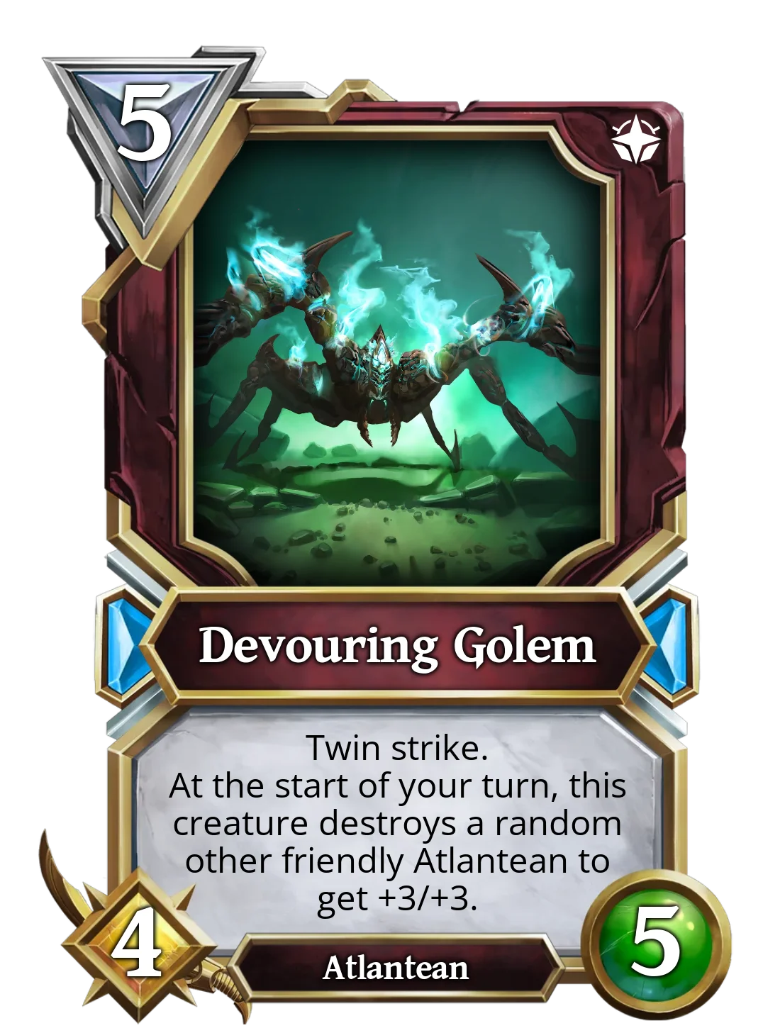 | It is currently the most used Golem in ranked battles, as it has a great effect for only 3 mana. This golem has Ward and, when summoned, will give ward to another Atlantean of your choice. This is good, as it negates 1 source of non-attack damage. | This Golem's effects only trigger when there are at least two allied creatures on the board when it is summoned, it gives the twin strike effect to a random one and the other will not be able to attack. It would be great if it allowed you to choose who gets the twin strike. Still, it could be great if silence effects appeared in the future, removing the creature's text. | Devouring Golem cares nothing for others, not even its own Atlantean allies, if anyone stands in its way, it will destroy them. If Devourer Golem starts the turn with any other allied Atlantean, it will destroy it, but at least increase its own stats by 3. |