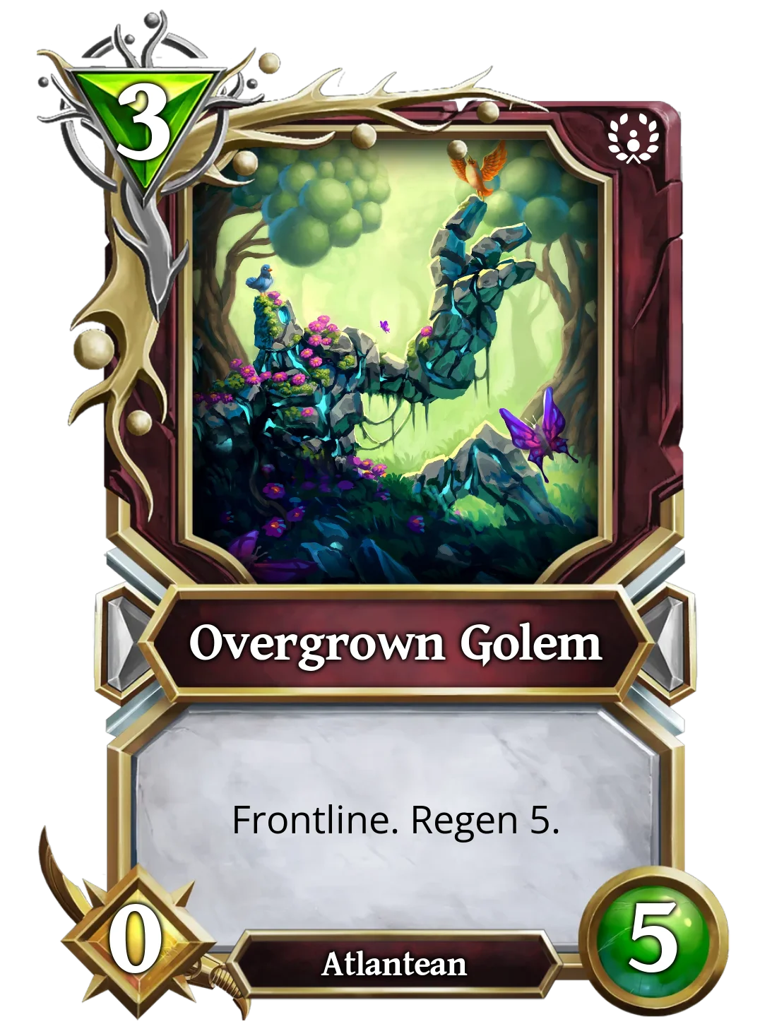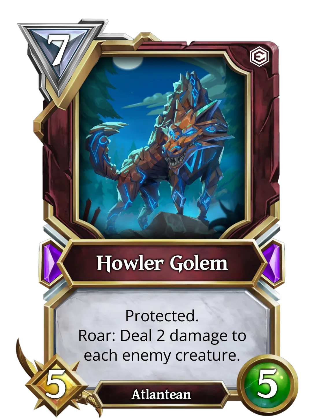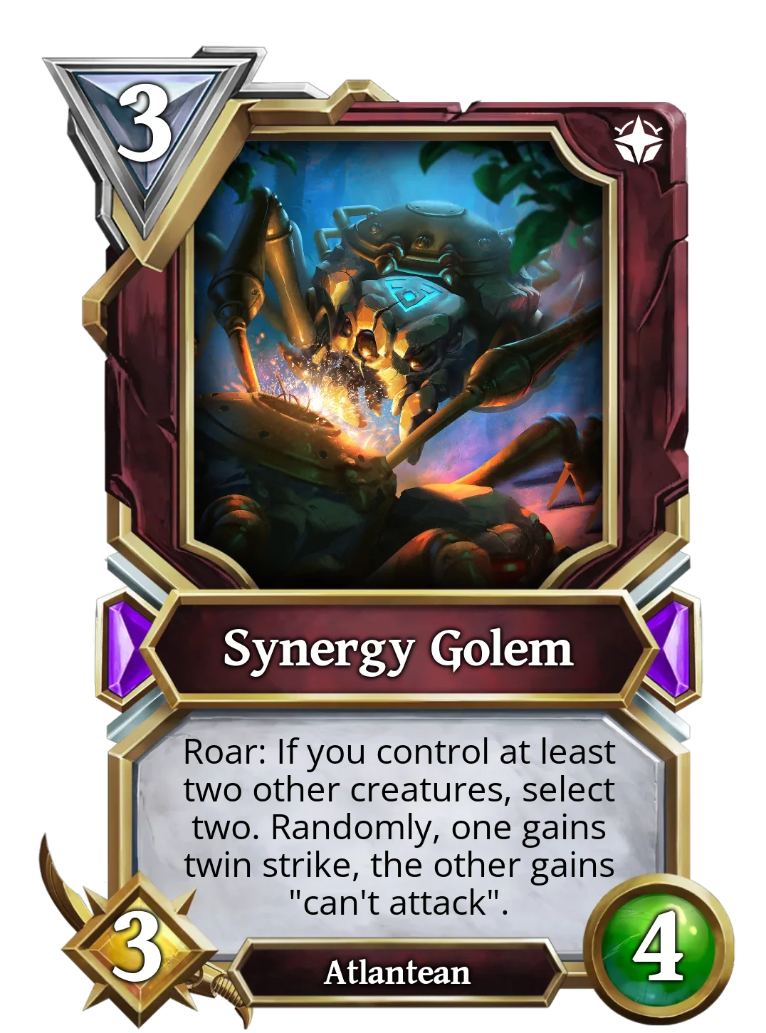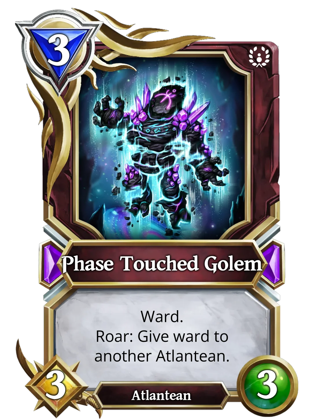 | It is currently the most used Golem in ranked battles, as it has a great effect for only 3 mana. This golem has Ward and, when summoned, will give ward to another Atlantean of your choice. This is good, as it negates 1 source of non-attack damage. | This Golem's effects only trigger when there are at least two allied creatures on the board when it is summoned, it gives the twin strike effect to a random one and the other will not be able to attack. It would be great if it allowed you to choose who gets the twin strike. Still, it could be great if silence effects appeared in the future, removing the creature's text. | Devouring Golem cares nothing for others, not even its own Atlantean allies, if anyone stands in its way, it will destroy them. If Devourer Golem starts the turn with any other allied Atlantean, it will destroy it, but at least increase its own stats by 3. |