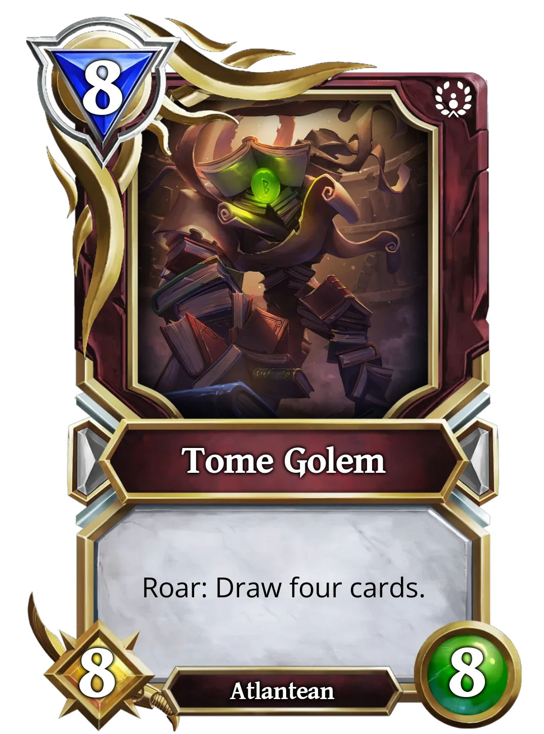 | The Howler Golem may only have 5/5 stats for a 7 mana creature, but when summoned thanks to its roar effect, it will deal 2 damage to each enemy creature. Also, when this Golem enter the board it gains protected. | Tome Golem is the only creature that allows the player to draw four cards. This effect is activated thanks to its Roar effect. Unfortunately, it costs 8 mana, so it's not used at all. |