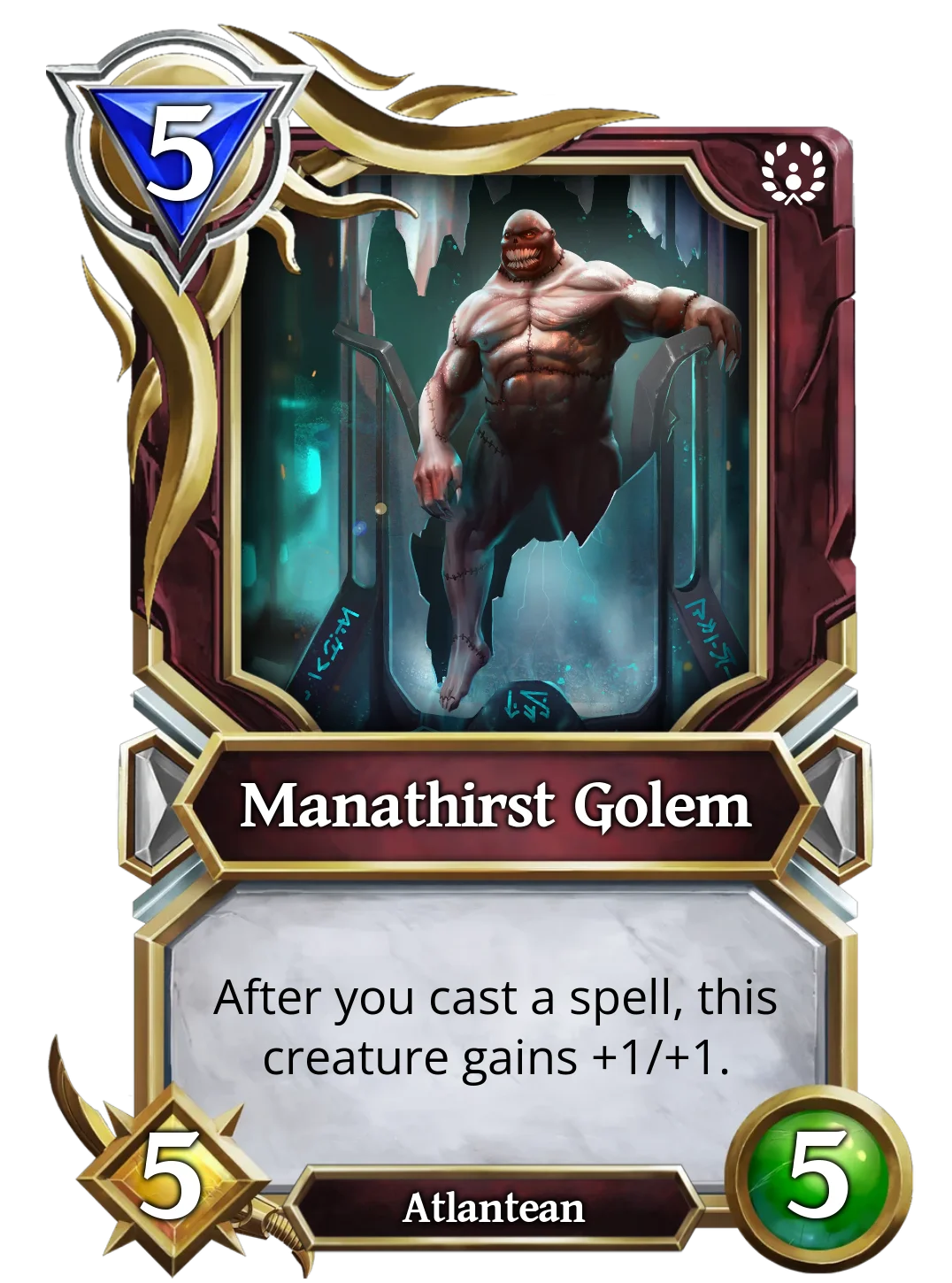 | It's one of only two 5 mana creatures that have higher stats, the other one is The Rotten One, also with 8/8 stats. The advantage of this Golem is that it cannot attack, but it can when you cast any spell during that turn. | Manathirst Golem only starts with 5/5 stats, but it can gain +1/+1 stats whenever you cast a spell, so the more you cast, the stronger it will become. |