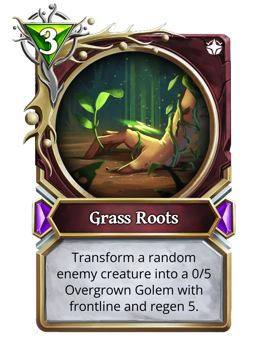 The Grass Roots spell can turn the battle in your favor by transforming an annoying enemy creature into a 0/5 Golem, this summoned golem has frontline and regen 5, but at least it has no attack. This spell may not be the best against magic decks that focus on spells, but it's really great against high mana creatures.