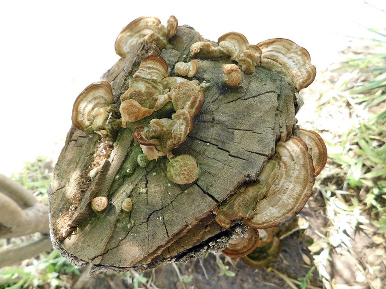 La verdad que la zona céntrica siempre nos está sorprendiendo y en esta ocasión han sido los ¨hongos¨ los protagonistas; al terminar de hacer nuestra sesión de fotografías fue el momento de regresar a casa, solo que en esta ocasión decidimos abordar un autobús que entra al barrio y nos deja muy cerca de nuestro hogar, y fue allí donde di con estos significativos ¨hongos¨ :  Como ven se apoderaron de un tronco de un árbol, y están conviviendo con ¨hongos¨ de otras especies