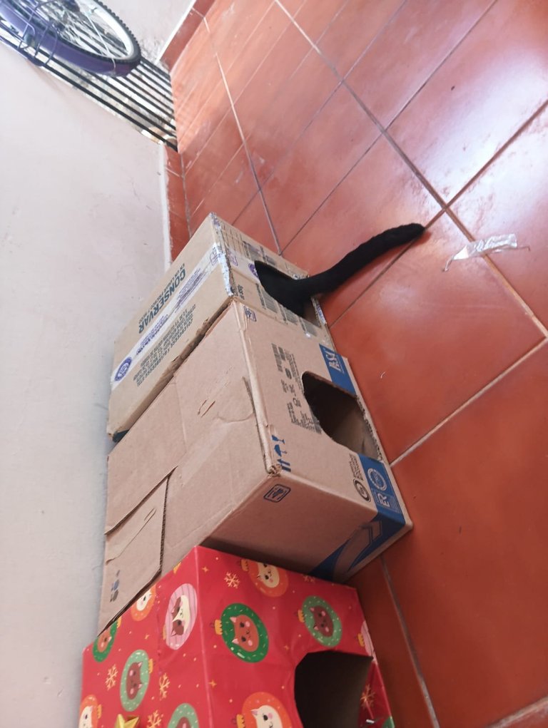 En estas vísperas navideñas, hemos preparado unas cajitas de cartón que vamos a forrar como regalos de navidad pero con un huequito para que los gatos puedan meterse ahí dentro, poco a poco ellos ya se están acostumbrando a entrar, próximamente les mostraré fotos de cómo quedaron las cajitas navideñas que les vamos a preparar.